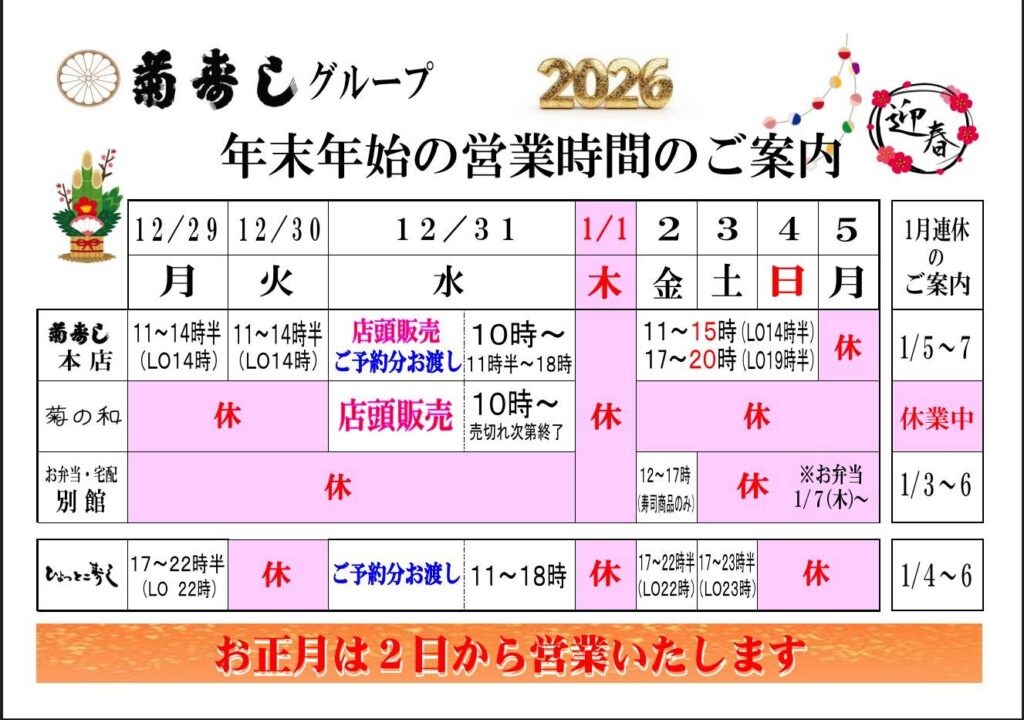 お知らせ 年末年始の営業案内 菊寿司グループ 全店 営業案内2025.12.28 菊寿司グループの年末年始の営業案内 いよいよ年の瀬も押し迫ってきました。菊寿司グループ各店舗の営業体制は以下の表のとおりです。 年末の年越し寿しについて 年末の 年越し寿し の予約分につきましては、 菊寿し本店 と ひょっとこ寿し にての受け渡しとさせていただきます。お間違えのないようにお願いいたします。 年末の店頭販売につきましては、 菊寿し本店 と 菊の和 の店頭にて 10時から販売 いたします。何卒よろしくお願い申し上げます。 Share お知らせ一覧 店舗 菊の和 (63) 菊寿司 本店 (97) 菊寿司 帯屋町店 (8) ひょっとこ寿司 (75) お弁当・宅配 (109) 全店 (102) カテゴリー お知らせ (209) 新メニュー (44) キャンペーン (64) 営業案内 (106) SNS (1) Instagram (0) LINE (0) Facebook (0) Youtube (0) 採用情報 (2) 絆コミュニティ (18) その他 (16) 新着記事 2025.12.28 営業案内|全店 年末年始の営業案内 菊寿司グループ 2025.12.27 お知らせ|菊寿司 本店 本店営業時間変更のお知らせ!! 2025.11.30 キャンペーン|お弁当・宅配 ⛄12月限定平日月替わり弁当⛄ アーカイブ 2025年 (64) 2024年 (71) 2023年 (86) 2022年 (85) 2021年 (34) 2020年 (35) 2019年 (48) 2018年 (37) ホーム / お知らせ / 営業案内 / 年末年始の営業案内 菊寿司グループ