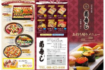 平日11:00~15:00/17:00~20:00 (Lo19:30) 金土日祝11:00~15:00/17:00~21:00 (Lo20:30) 第1.3火曜日11:00~17:00(Lo16:30) テイクアウトに関してのお知らせ 当店は商品の作り置きをしておりません。 週末やイベント時はお時間を頂く場合がございます。 お急ぎの際は、ご予約をお願い致します。 TEL 088-823-8400 菊寿司本店 までお電話お待ちしております。 GWや年末年始などの繁忙期のあいだは下記サービスをお休みさせていただきます。--> ランチタイム 2階での食後のコーヒーを150円(税別)で提供しております。 ※コーヒーの香りが出るため、2階のみのサービスとしております。 |